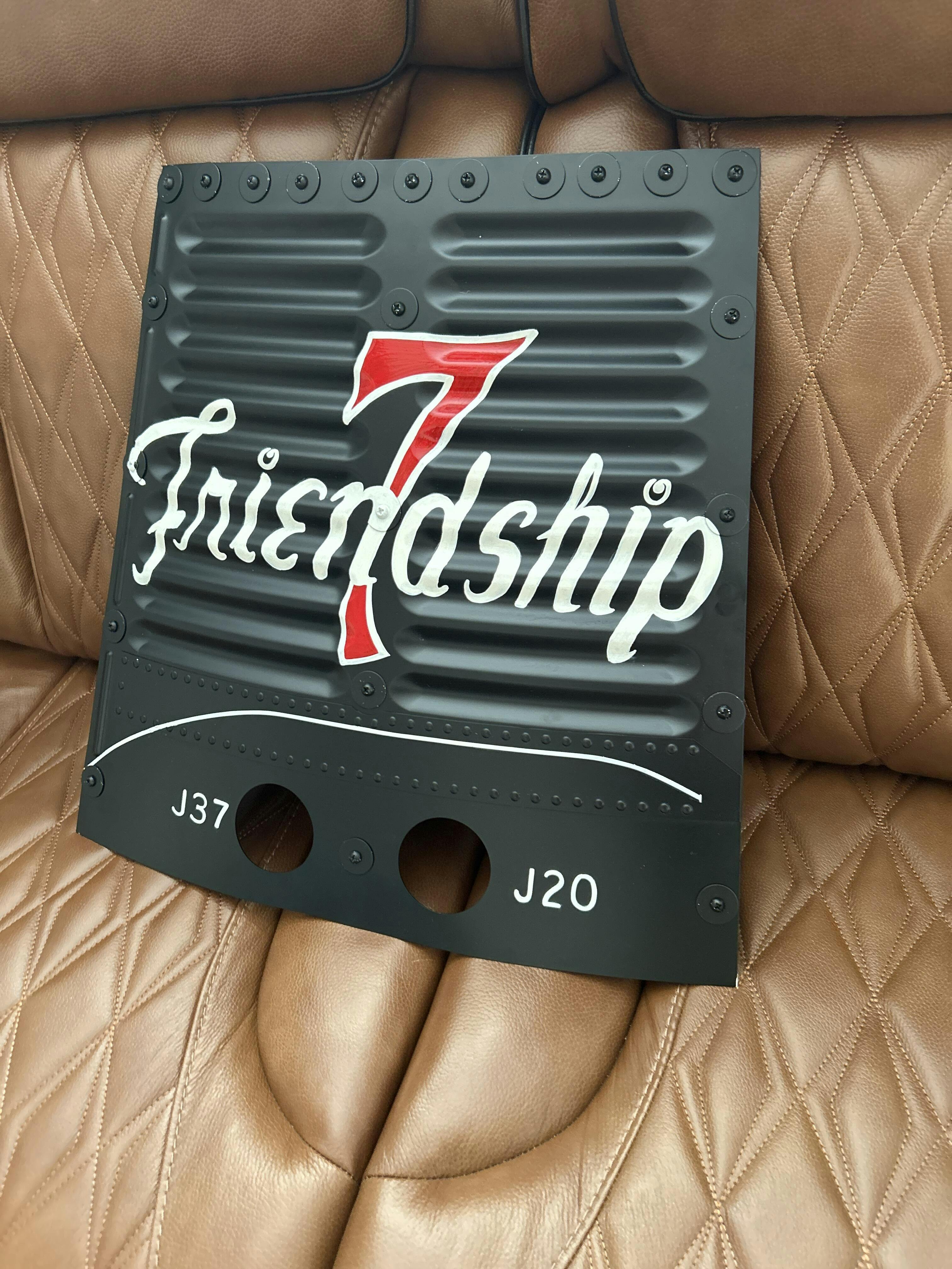 Inspired by Cece Bibby, the original artist who painted Friendship 7, Aurora 7, & Sigma 7. Using a local, 50-year veteran sign painter, we are hand painting each nose art shingle EXACTLY as it was painted by Cece in the 1960s. Each shingle is designed to look like the originals in every way: exactly as if was painted then removed from the spacecraft: seam lines, bolt & washers hardware, and all!