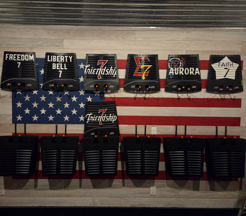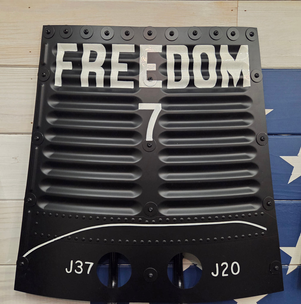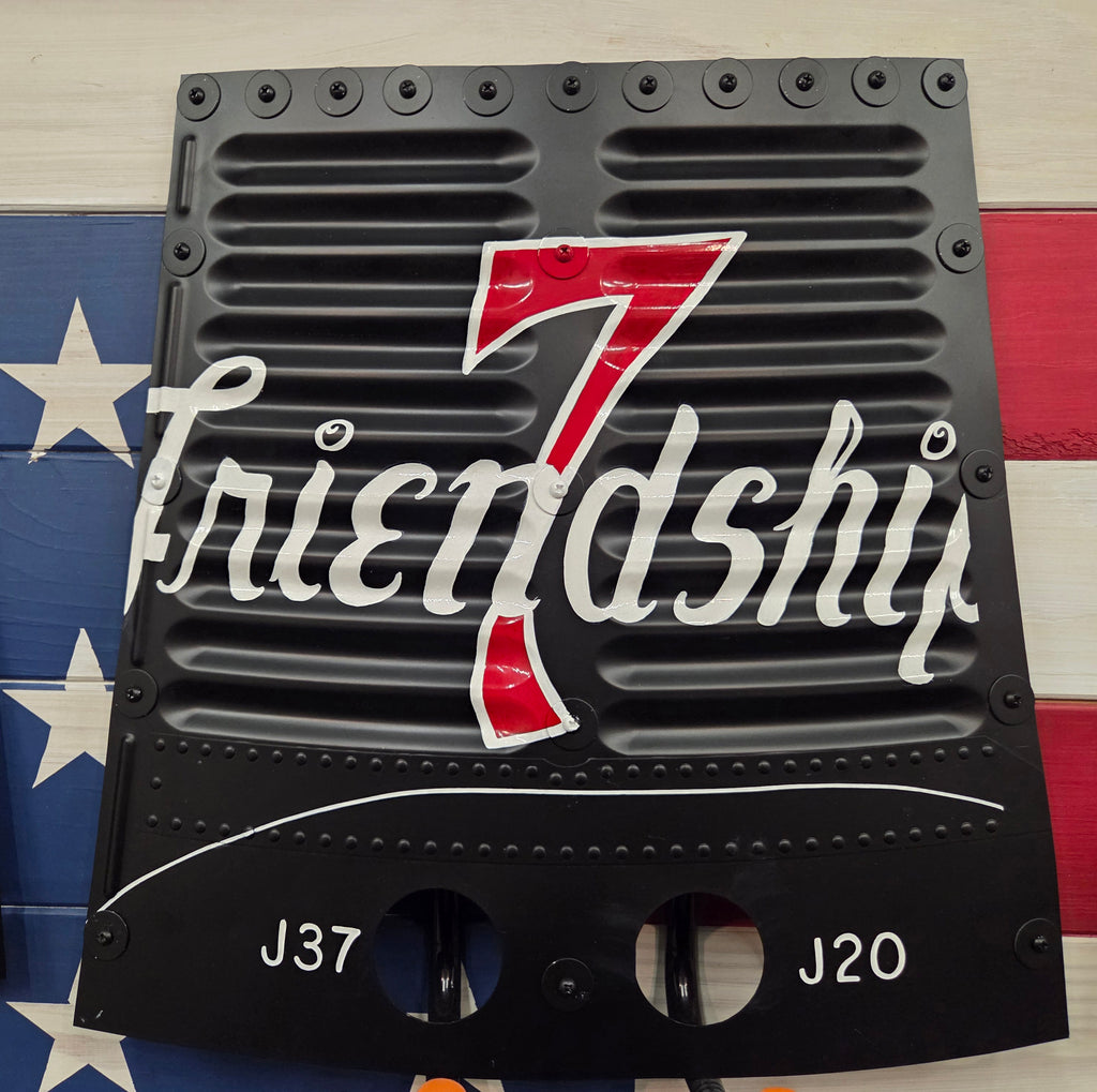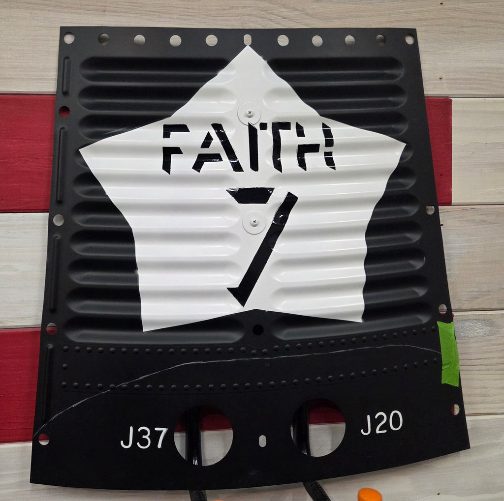 Inspired by Cece Bibby, the original artist who painted Friendship 7, Aurora 7, & Sigma 7. Using a local, 50-year veteran sign painter, we are hand painting each nose art shingle EXACTLY as it was painted by Cece in the 1960s. Each shingle is designed to look like the originals in every way: exactly as if was painted then removed from the spacecraft: seam lines, bolt & washers hardware, and all!