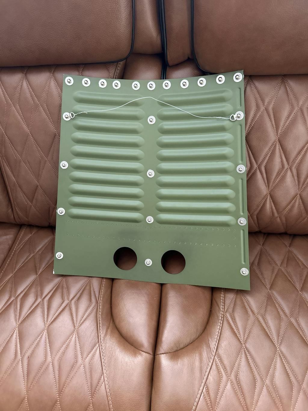 These shingles are recreated in aluminum, painted in the historic green zinc phosphate color on the back, and charcoal black on the front, similar to the Mercury capsule test mockups that were built by McDonnell Aircraft during the Mercury program. The flight-ready Mercury spacecraft used Rene 41 steel alloy for their shingles, to better protect the craft from launch & reentry heat.